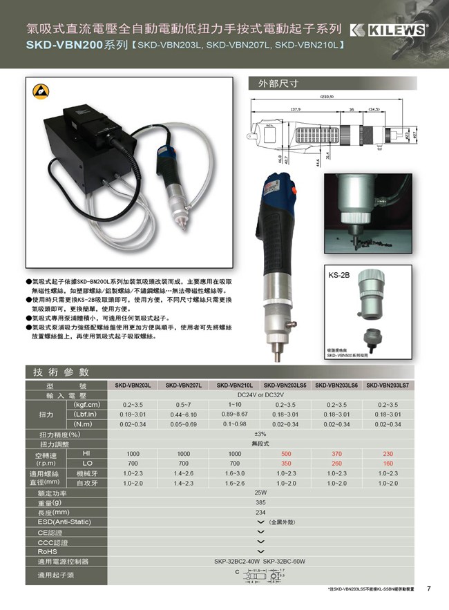 奇力速电动起子 电批 SKD-VBN200系列 气吸式 SKD-VBN200系列 中文原文目录 气吸式起子依据SKD-BN200L系列加装气吸头改装而成,主要应用在吸取如塑胶螺丝/铝制螺丝/不锈钢螺丝等无磁性螺丝 使用时只需更换不同尺寸螺丝只需更换气吸头即可,更换简单,使用方便 气吸式专用泵浦体积小,可适用任何气吸式起子 气吸式泵浦吸力强搭配螺丝盘使用更加方便与顺手 商品说明 产品咨询 上一篇: SKD-BN200系列 下一篇: SKD-BE500系列 所属子站ID: 产品名称 联系人 联系电话 电子邮箱 公司名称 咨询内容