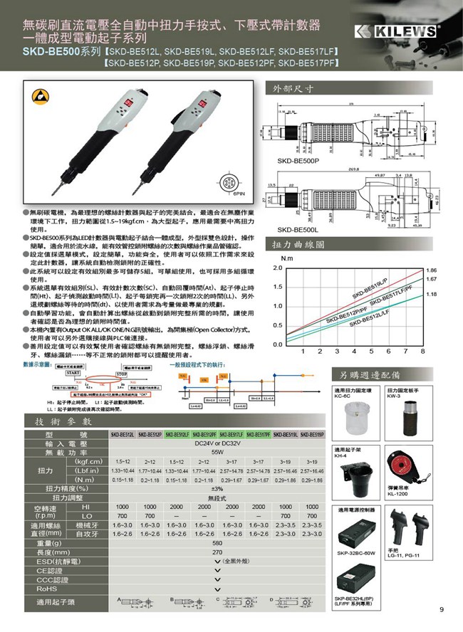奇力速电动起子 电批 SKD-BE500系列 SKD-BE500系列 中文原文目录 无碳刷电机,为最理想的螺丝计数器与起子的完美结合,最适合在无尘作业环境下工作,扭力范围从1.5~19Kgf.cm,为大型起子,适用于中高扭力使用 SKD-BE500系列为LED计数器与起子结合一体成型,外形采双色设计,操作简单,适合用于流水线,能有效管控锁附螺丝的次数与螺丝作业品管确认 商品说明 产品咨询 上一篇: SKD-VBN200系列 气吸式 下一篇: SKD-BN500系列 所属子站ID: 产品名称 联系人 联系电话 电子邮箱 公司名称 咨询内容