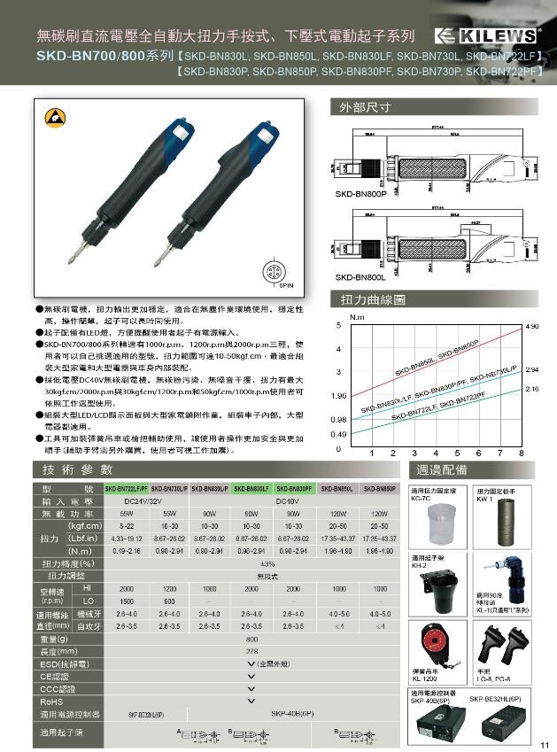 奇力速电动起子 电批 SKD-BN700/800系列 SKD-BN700/800系列 中文原文目录 无碳刷电机,扭力输出更加稳定,适合在无尘作业环境使用,稳定性高,操作简单,起子可以长时间使用 起子配备LED灯,方便提醒使用者起子有电源输入 组装大型LED/LCD显示面板与大型家电锁附作业,组装车子内部,大型电器都适用 工具可加装弹簧吊车或枪把,让使用者操作更加安全与顺手(辅助手臂需另外购买,使用者可视工作加购) 商品说明 产品咨询 上一篇: SKD-VBN500系列 气吸式 下一篇: TW-369-2F 所属子站ID: 产品名称 联系人 联系电话 电子邮箱 公司名称 咨询内容