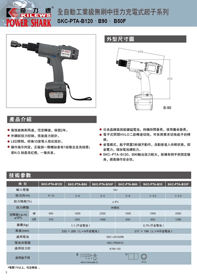 充电式电动起子 SKC-PTA-B120 B90 B50F SKC-PTA-B120 B90 B50F 中文原文目录 高性能无刷马达,恒定转速,保固2年 外调试扭力控制,低后坐力设计 LED照明,仰角10度等人性化设计 日本品牌高效能锂锰电池,待机时间最长,使用寿命最长 SKC-PTA-B120、B90输出扭力较大,配备有侧手把固定枪身,提高操作安全性 商品说明 产品咨询 上一篇: SKC-PTA120 SKC-PTA-80 下一篇: SKC-PTA-B60 B35 B35F 所属子站ID: 产品名称 联系人 联系电话 电子邮箱 公司名称 咨询内容