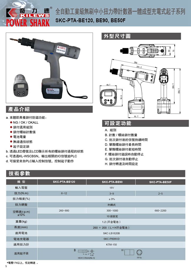 充电式电动起子 SKC-PTA-BE120 BE90 BE50F SKC-PTA-BE120 90 50F 中文原文目录 1.本体即具备锁附放错功能: NG/OK/OKALL 锁附选用组别 锁附螺丝计数值 电池电量 无线通信状态 起子设定锁 2.透过LED灯号及LCD显示所有的螺丝锁附过程的状态 3.可透过KL-WSCBSN,输出相关的IO信号给PLC 4.可接受来自PLC输入控制信号,控制起子动作 商品说明 产品咨询 上一篇: SKC-PTA-B60 B35 B35F 下一篇: SKC-PTA-L300 600 所属子站ID: 产品名称 联系人 联系电话 电子邮箱 公司名称 咨询内容