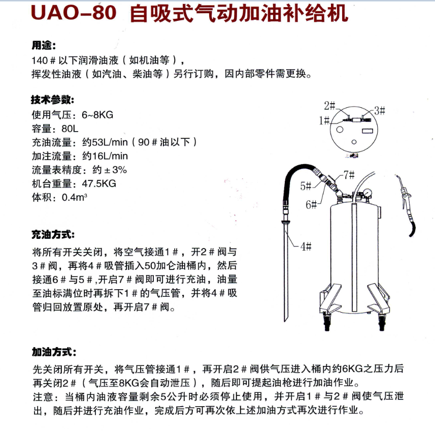 先關閉所有開關,將氣壓管接通1#,再開啟2#閥供氣壓進入桶內約6KG之壓力後再關閉2#(氣壓至8KG會自動洩壓),隨後即可提起油槍進行加油作業。