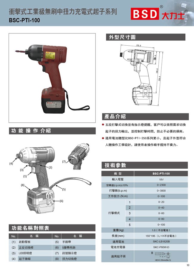 充电式电动起子 BSC-PTI-100 BSC-PTI-100 中文原文目录 五段打击式切换有指示灯提醒,客户可以依照需求切换起子的扭力输出,并控制打击时间,防止不必要的损耗 适用电池型比BSC-PTI-250系列更小,且起子外形符合人体操作工学设计,让使用者操作顺手握持不费力 商品说明 产品咨询 上一篇: BSC-PTS-120 80 50 下一篇: BSC-PTI-250 BSC-PTI-160 所属子站ID: 产品名称 联系人 联系电话 电子邮箱 公司名称 咨询内容