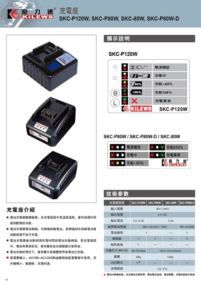 奇力速电动起子 电批 充电座 SKC-P80 80W P80W-D SKC-P80 80W P80W-D 中文原文目录 电池充电器数显荧幕,在充电过程中若温度过高,会作保护作用达到断电的功能 电池充电器电池辨识,可辨识原厂电池,若辨识到非原厂电池会自动保护不给予充电 电池充电器会自动侦测充电时间与电池容量辨识,若充电过程中,电池有异常状况,会有警告及灯号提示使用者 电池充饱的情况下,会有警示音提醒使用者电池已充饱 宽电压输入,ACV90~ACV240无论哪个地区电压都可使用,另外体积小、重量轻、充电快速 商品说明 产品咨询 上一篇: 充电电池 SKC-LB1820 1820B 下一篇: 充电座 SKC-P120W 所属子站ID: 产品名称 联系人 联系电话 电子邮箱 公司名称 咨询内容