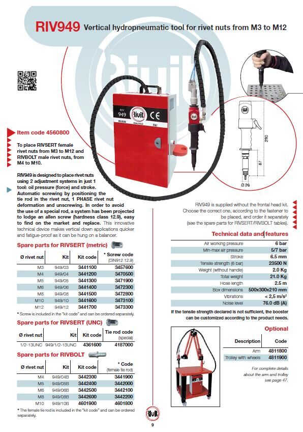 意大利气动铆接工具 RIV949 产地:意大利 品牌:RIVIT/力威得 所需气压:5~7 bar 最大行程:6.5 mm 最大工具拉伸:21000 N 重量:20 kg 气管长度:2.5米 箱子尺寸::500x300x210mm 适用范围:M3~M12 螺母 商品说明 产品咨询 油压气动铆螺母枪 型号: RIV949 (适用于M3~M12螺母) 上一篇: RIV536 下一篇: RIV750 所属子站ID: 产品名称 联系人 联系电话 电子邮箱 公司名称 咨询内容