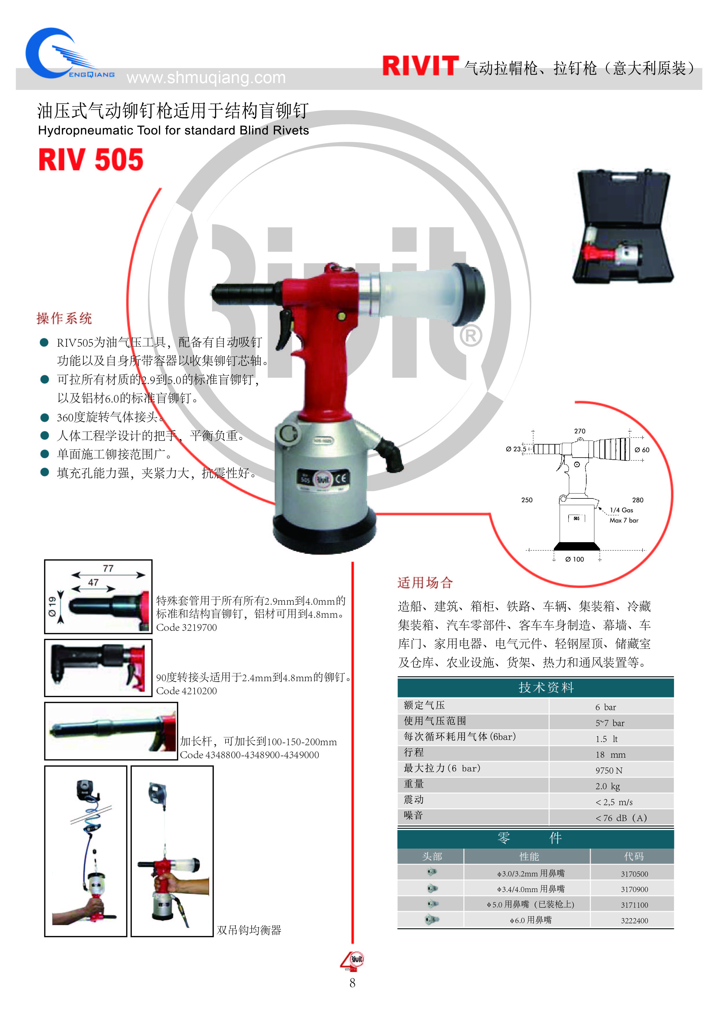 RIV505为油压气动铆钉枪,配备有自动吸钉功能以及自身所带容器以收集铆钉芯轴。可拉所有材质的标准抽芯铆钉,从2.9mm到5.0mm。360度旋转气体接头。人体工程学设计的手把,平衡负重。单面施工铆接范围广。填充孔能力强,加紧力大,抗震性好。 铆接断口平整,销芯能力强。