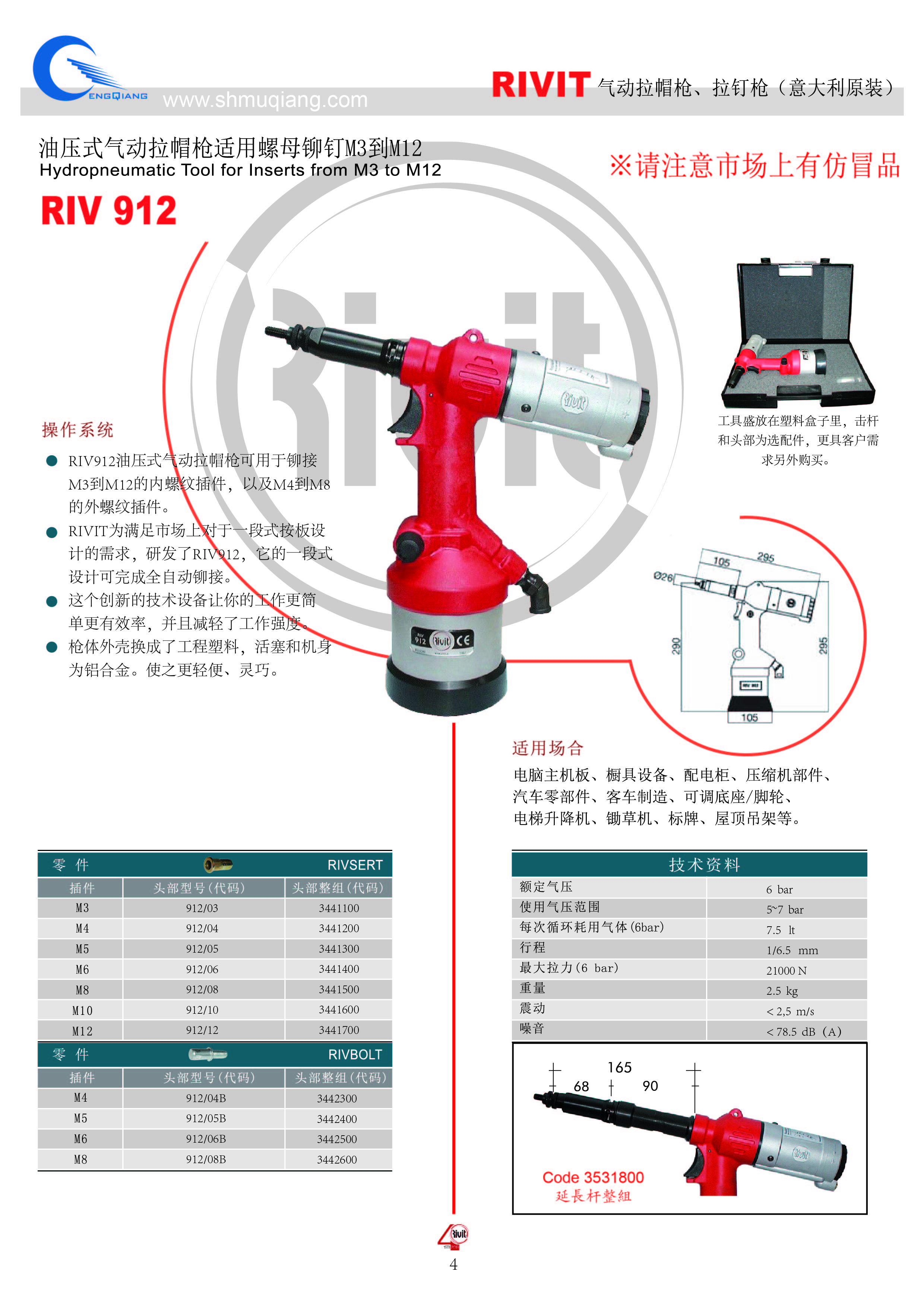RIV912 油压式气动拉帽枪可用于铆接M3~M12的内螺纹插件,以及M4~M8的外螺纹插件。